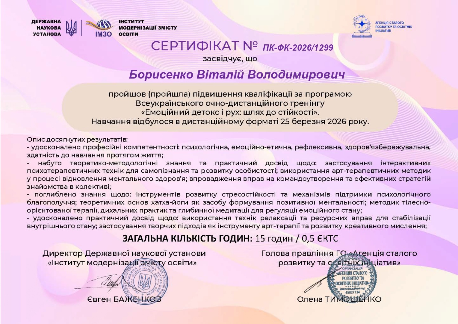 За результатами участі у тренінгу Віталій БОРИСЕНКО успішно пройшов підвищення кваліфікації та отримав сертифікат обсягом 15 годин (0,5 кредита ЄКТС), що відповідає вимогам чинного законодавства щодо підвищення кваліфікації педагогічних і науково-педагогічних працівників.