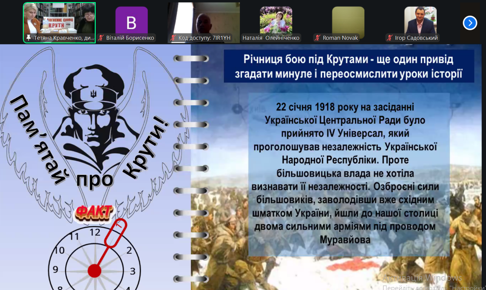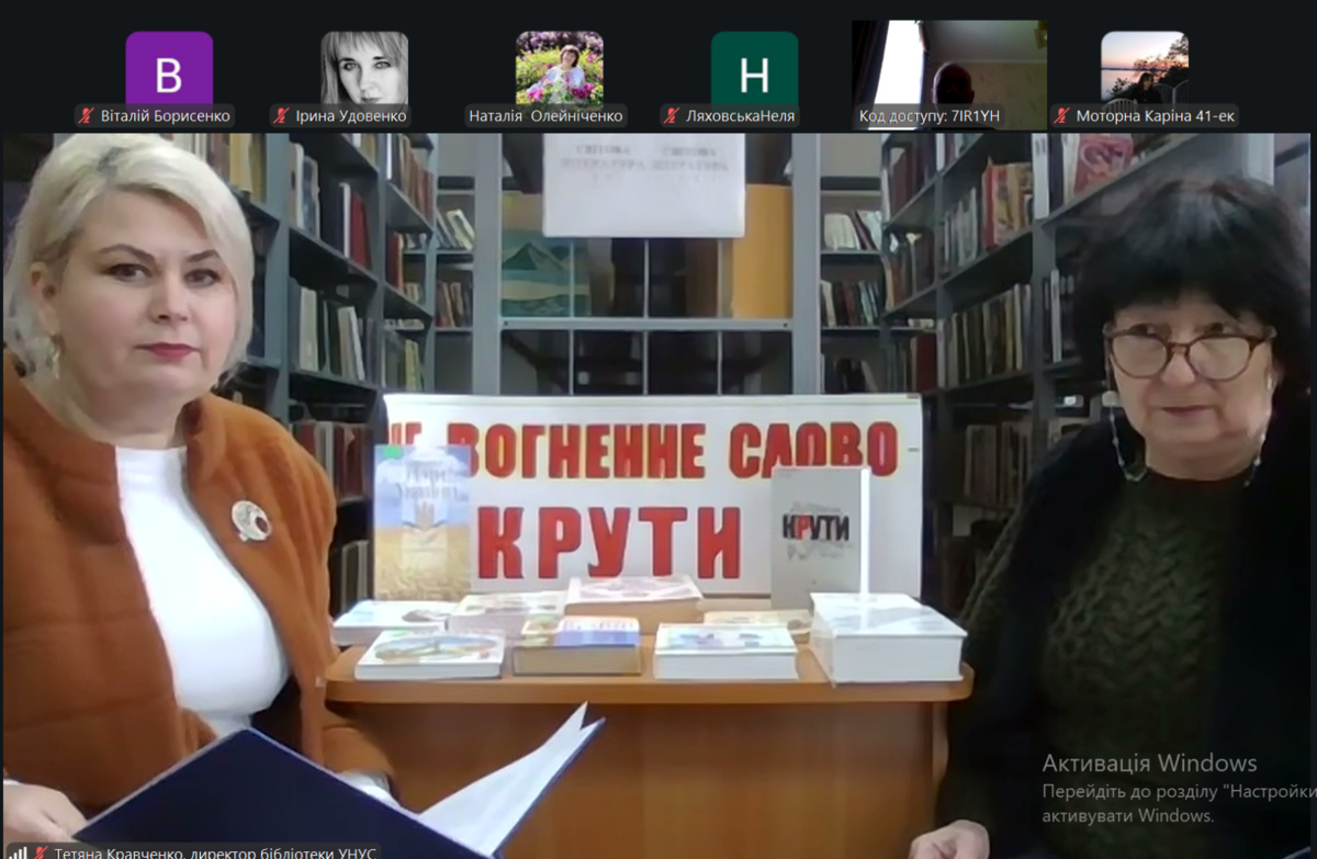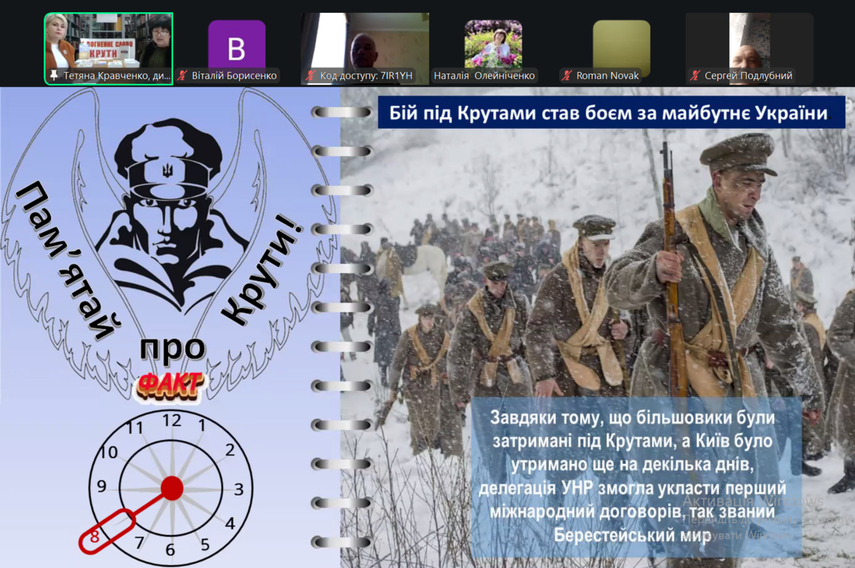 У бібліотеці університету відбувся історичний онлайн-екскурс «Крути: молодість, що стала на захист держави». Захід проходив в онлайн-форматі на платформі Zoom та був спрямований на вшанування пам’яті українських студентів і гімназистів, які 29 січня 1918 року проявили надзвичайну мужність, патріотизм і самопожертву в боротьбі за незалежність Української Народної Республіки.
