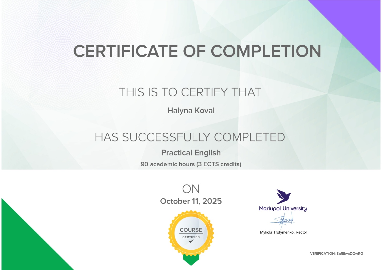 11 жовтня 2025 року доцентка кафедри загального землеробства Галина КОВАЛЬ успішно пройшла курс англійської мови Practical English New Edition, розроблений Маріупольським державним університетом. Курс був створений для початкового та просунутого рівнів і охоплює рівень володіння мовою — від A0 до C1.